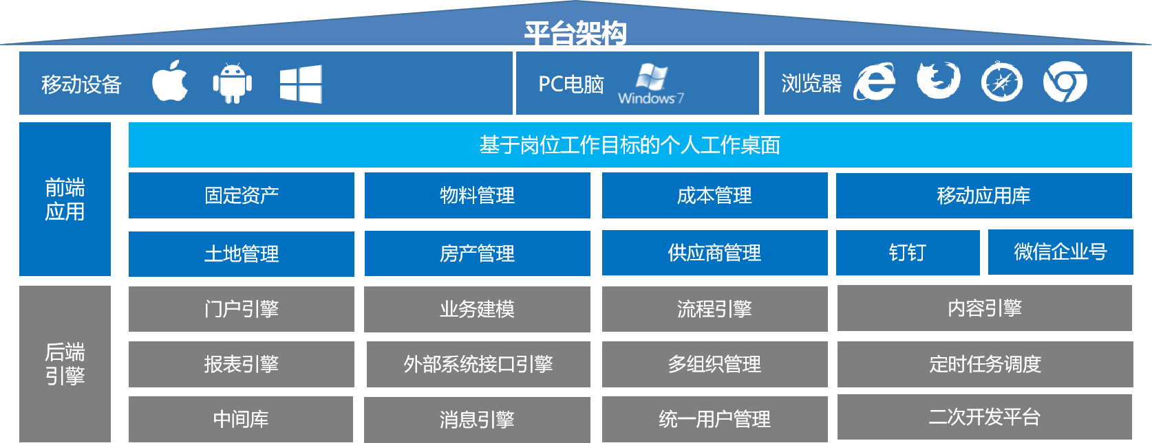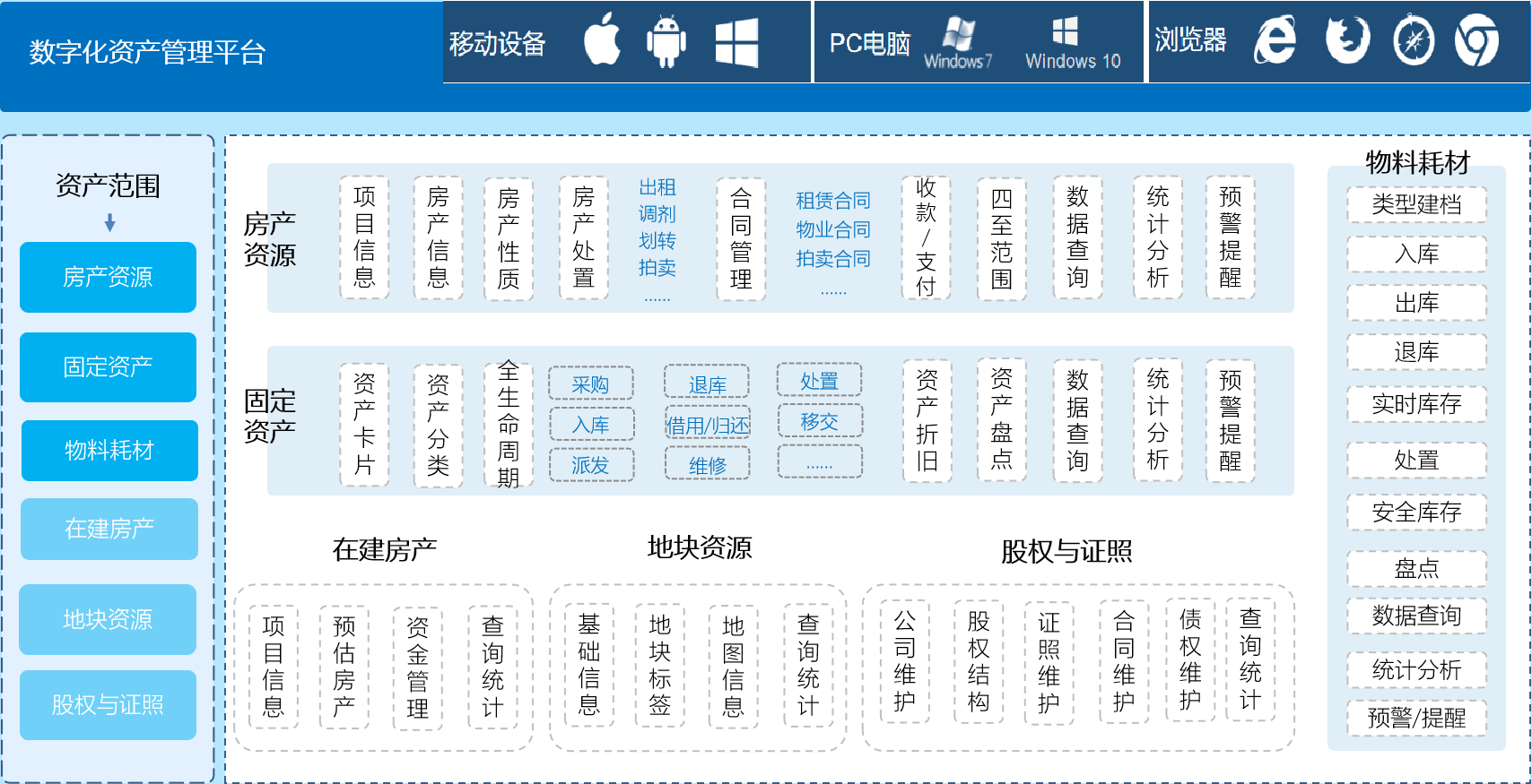 资产范围不但包含传统的固定资产、设备、低值易耗品,还包含国企、集团企业需要的土地、房产、股权证照等资产。当然可根据用户要求个性化部署,分步实施。
