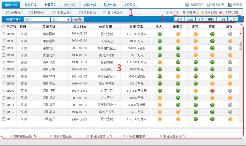 通过数据的维护,可实时查询公司类型、股权结构、证照、合同等相关数据。